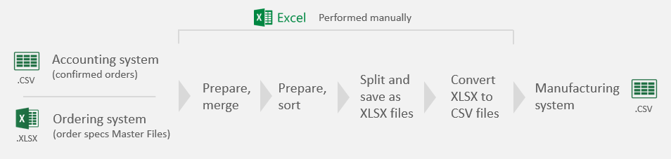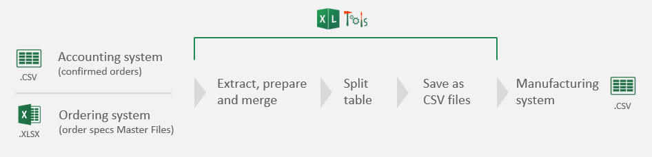 The process runs with no stops from the beginning to the end: preparing order confirmations and specifications, merging tables, splitting orders by the type of printing job required, and eventually saving as separate CSV files.