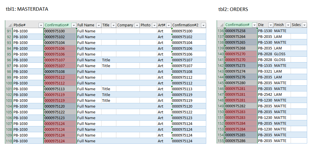 If you need to append MASTERDATA table with columns from the ORDERS table, you could potentially use a VLOOKUP function. But here’s the problem: multiple rows refer to the same confirmation number. VLOOKUP would be incorrect is this case, since it takes into account only the first record.