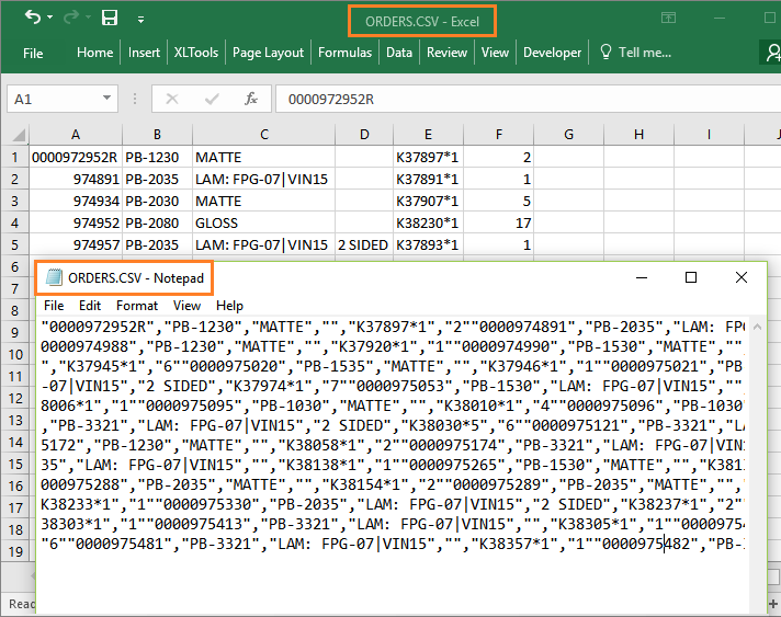 Information about confirmed orders comes from an accounting system in CSV format. The problem is, simply opening the ORDERS.CSV file in Excel is just not enough. Here we face a typical problem: order confirmation numbers (column A) lose the necessary leading zeros. So, the table will require additional formatting.