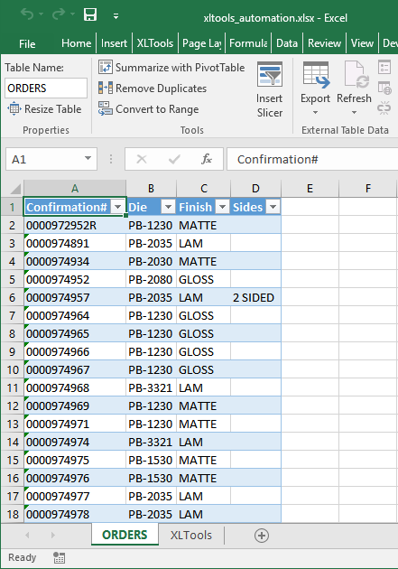 Now that both tables (ORDERS and MASTERDATA) are properly formatted, we need to merge them by their common field – the “Confirmation#”.