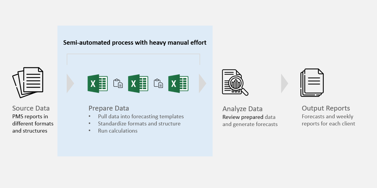 Each client often represents multiple hotels or brands, and each brings a different type of source data. Since the accuracy of forecasting depends heavily on the quality of source data, preparing data correctly was critical — and increasingly time-consuming.