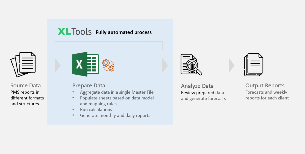 - Automated Data Pulls The routine task of extracting source data and aggregating it into a single file was fully automated.All that’s required is to place the source files — reports from hotel property management systems — into the “Reports” folder located in the same directory as the Forecasting Master File.Regardless of file type (Excel or CSV), report structure, or format, XLTools automatically detects the correct files using keywords in the file names and extracts the necessary data with precision.automated data pull from reports
