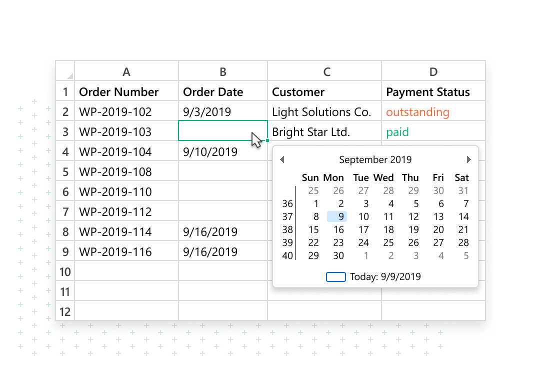 Simply select a cell and pick a date or time from the calendar.